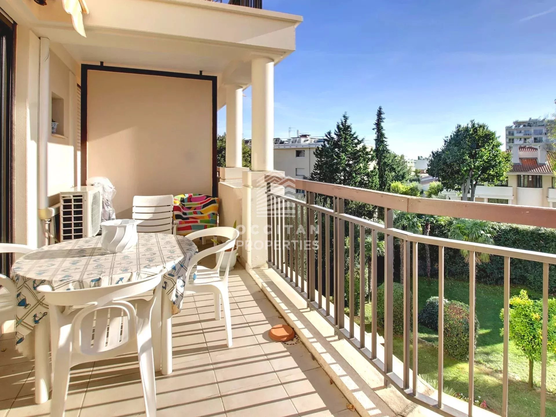 A vendre, à 15 minutes à pied de la rue d'Antibes et 100 mètres des commerces avec une spacieuse terrasse vue dégagée exposée au sud dans une résidence de standing avec piscine et parc arboré. 3 pièces composé d'un confortable séjour, d'une cuisine, deux chambres, une salle de bain et un toilette indépendant. Un garage et une cave complètent le bien.